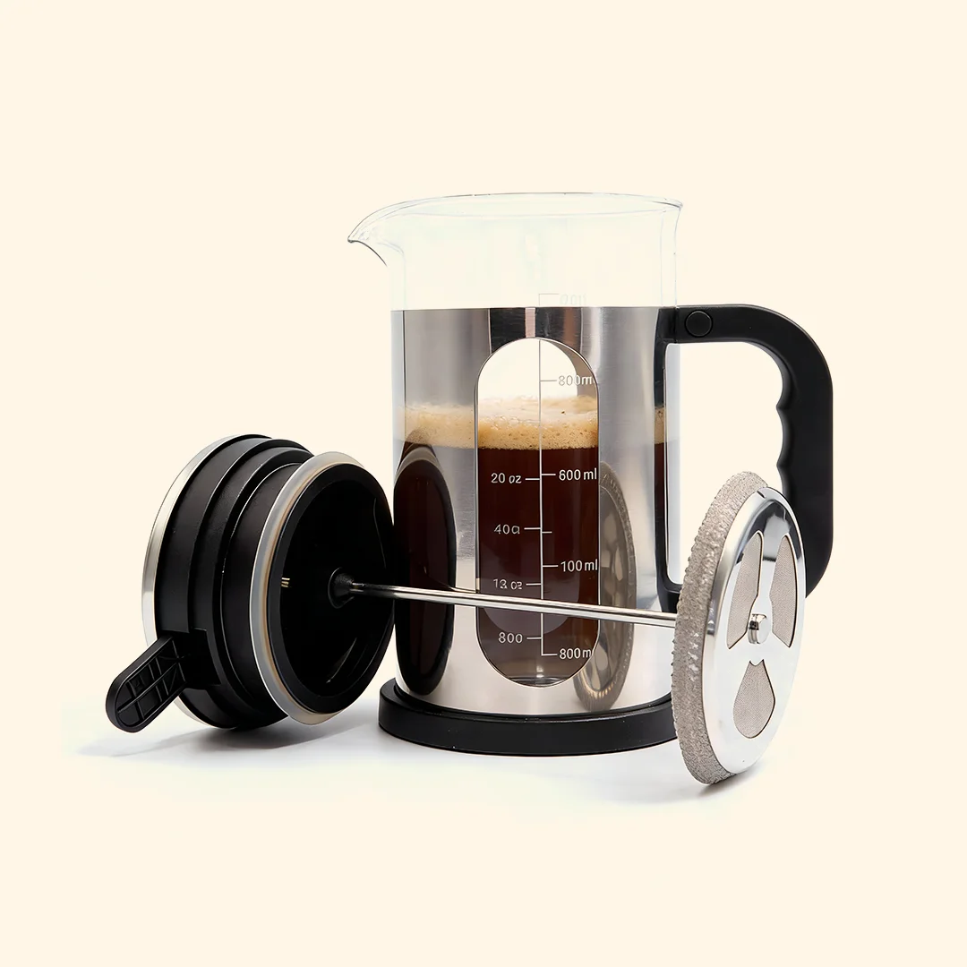 Disfruta un café intenso y aromático con esta prensa francesa de 800 ml, fabricada con acero inoxidable y vidrio resistente. Su diseño elegante y funcional permite una extracción uniforme, ideal para uso en casa u oficina.