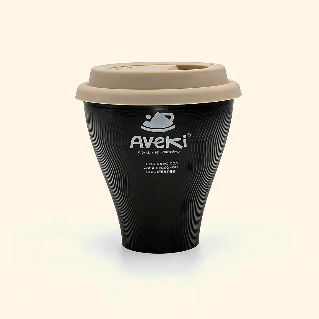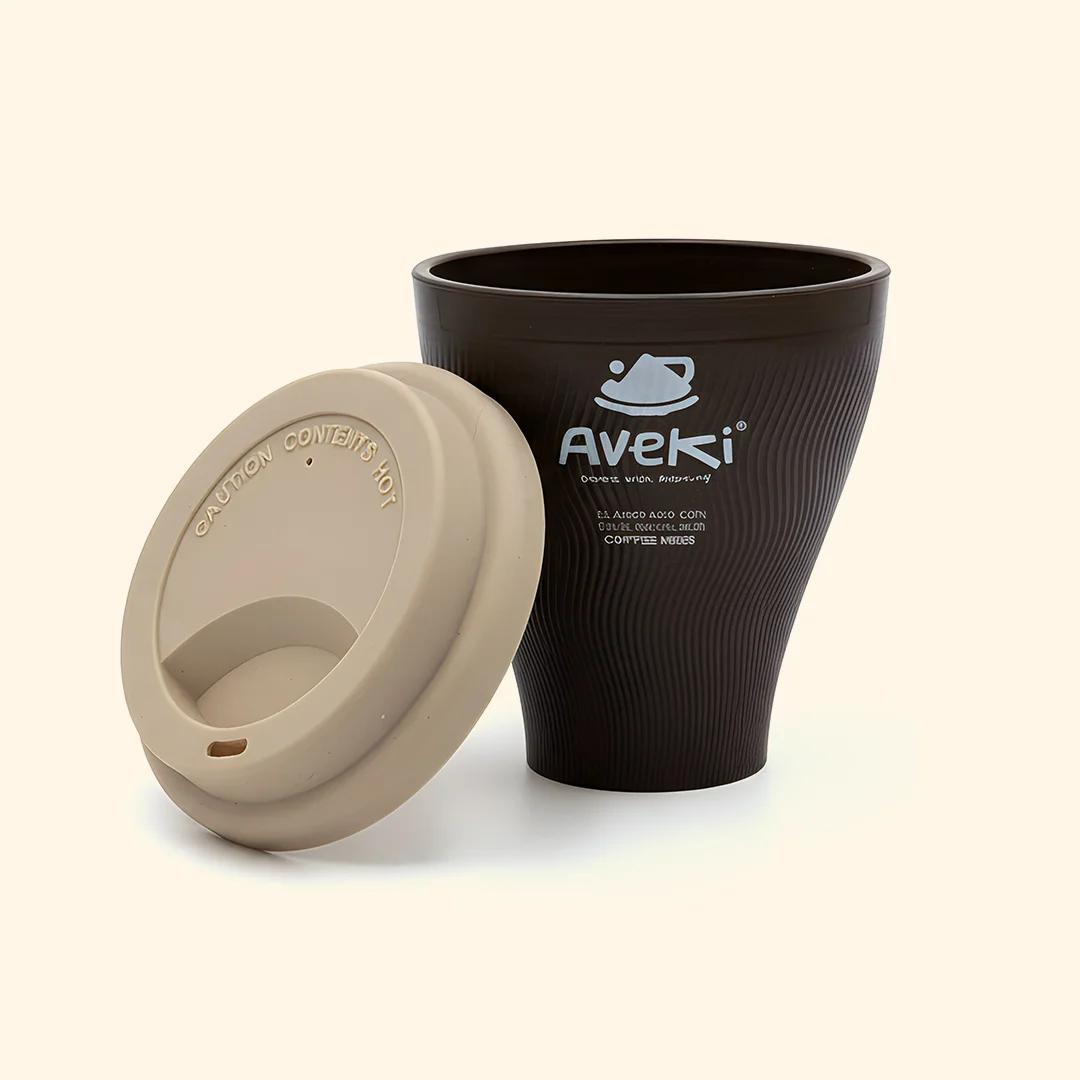 Taza reutilizable fabricada a partir de borra de café reciclada, acompañada de tapa de silicona para mayor comodidad. Un diseño moderno que combina funcionalidad y sostenibilidad.